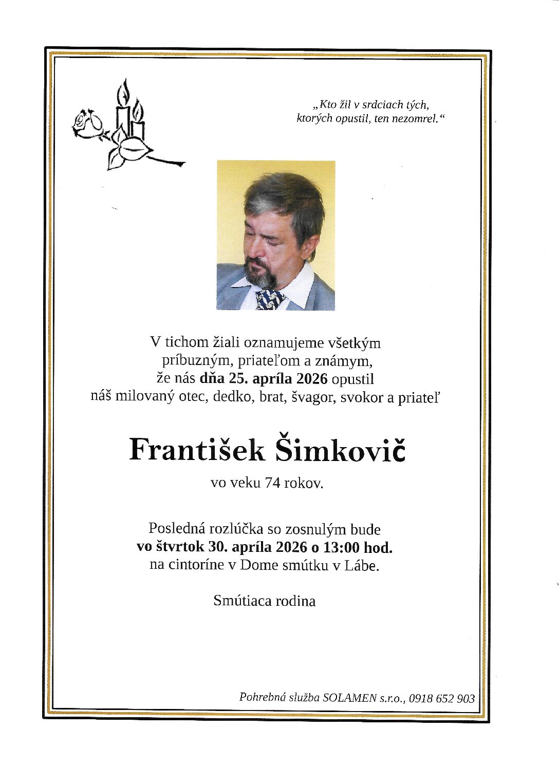 Smútočný oznam – Šimkovič František Domov / Novinky / Príspevok bol presunutý do archívu 13:43 01.05.2026
